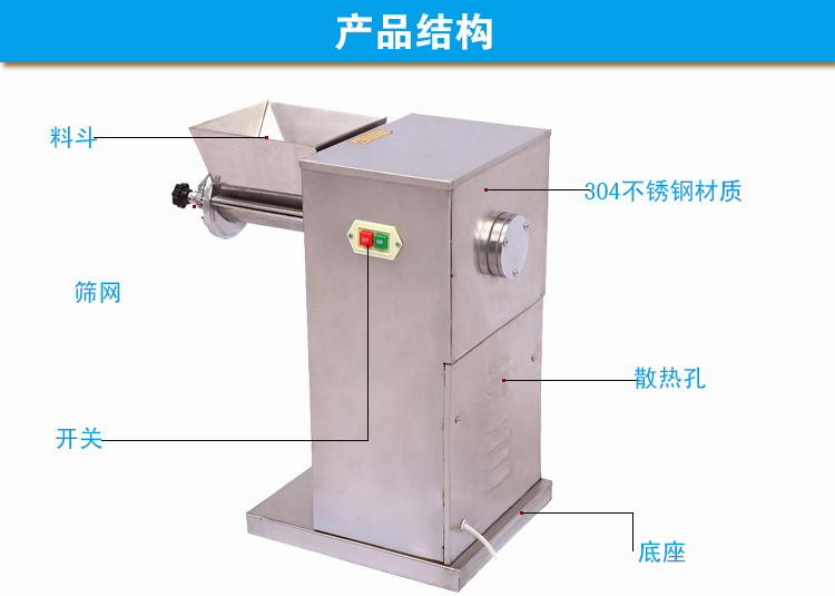 该机可将混合的粉末状物料制成颗粒,也可将块状的干料粉碎成所需的颗粒。适用于制药、化工、食品、科研