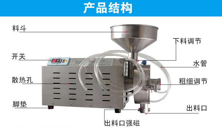 ![]() ![]() 工作原理 磨粉机的电机启动运转时,连接轴以及套在连接轴上的磨盘一起运转。待磨物料从料斗进入磨粉套,磨盘的绞龙 水冷工作原理:磨粉腔外壁和磨粉腔底部都设计有一个夹水层,夹层里设有隔套,保证水能够循环,没有死角。通 优点:1. 低温磨粉,保留五谷营养价值;2. 低温磨粉,不再烧糊物料 技术参数