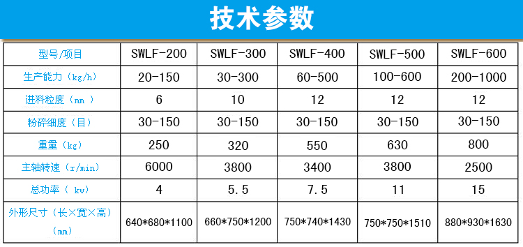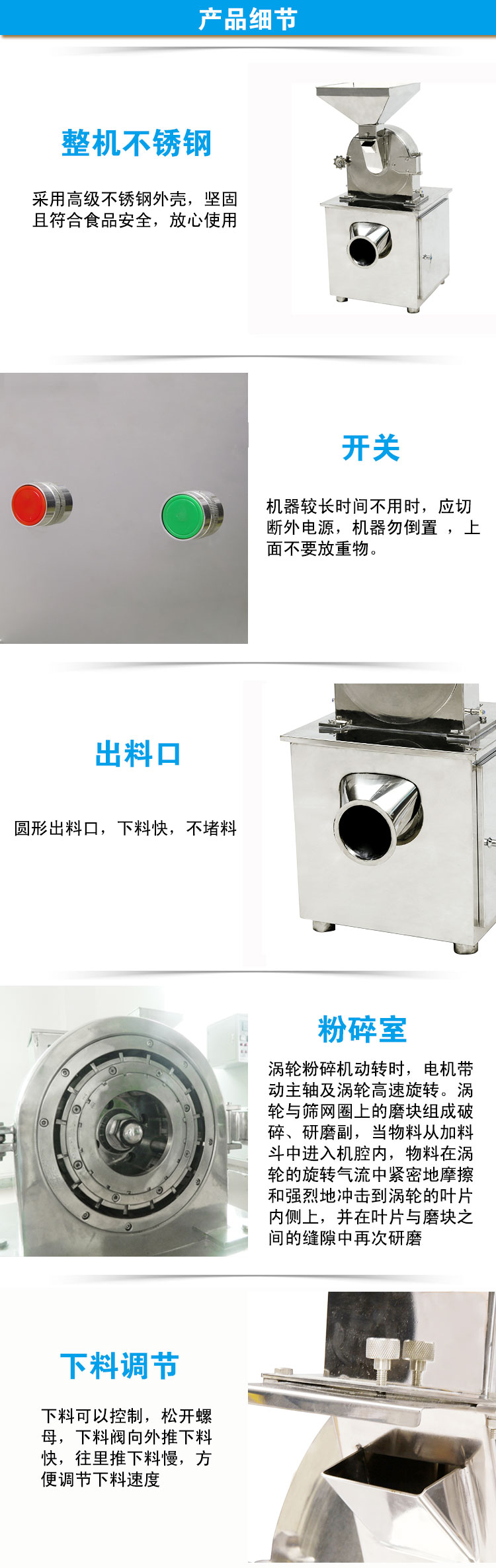烘干蔬菜)等中低硬度物料的粉碎加工,细度在30-150目之间调节,具有产量高、粒度细、噪声低、能耗低、维修简单、
